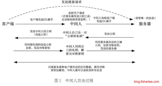 方案:握手后,服务器返回公匙,然后客户端随机生成一个key,然后用公匙加密。服务器获得后用私匙解密。随后双方用key作为对称加密数据。中间人无法窃听到服务器中的数据,因为被公匙加密的数据,只有私匙才能解密。