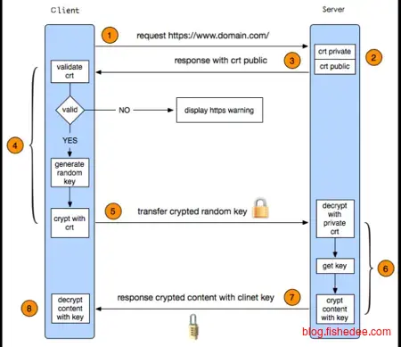 这部分传送的是用证书加密后的随机值,目的就是让服务端得到这个随机值,以后客户端和服务端的通信就可以通过这个随机值来进行加密解密了。 ## 服务段解密信息 服务端用私钥解密后,得到了客户端传过来的随机值(私钥),然后把内容通过该值进行对称加密。所谓对称加密就是,将信息和私钥通过某种算法混合在一起,这样除非知道私钥,不然无法获取内容,而正好客户端和服务端都知道这个私钥,所以只要加密算法够彪悍,私钥够复杂,数据就够安全。 ## 传输加密后的信息 这部分信息是服务段用私钥加密后的信息,可以在客户端被还原。