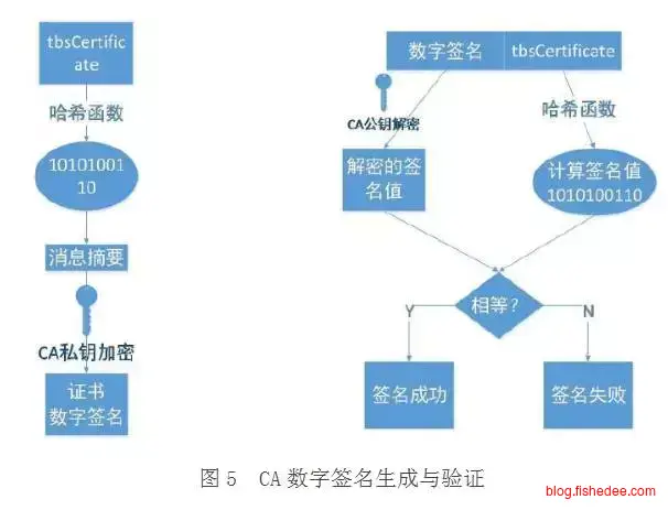 1、数字签名的签发。首先是使用哈希函数对待签名内容进行安全哈希,生成消息摘要,然后使用 CA 自己的私钥对消息摘要进行加密。 2、数字签名的校验。使用 CA 的公钥解密签名,然后使用相同的签名函数对待签名证书内容进行签名并和服务端数字签名里的签名内容进行比较,如果相同就认为校验成功。