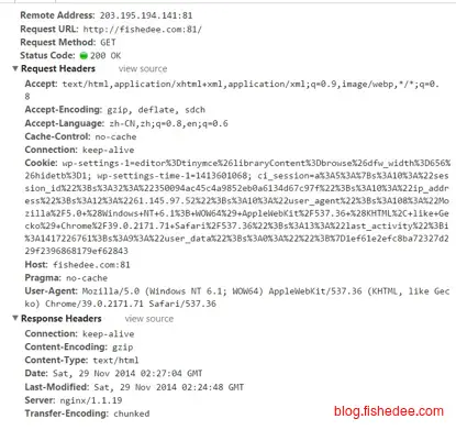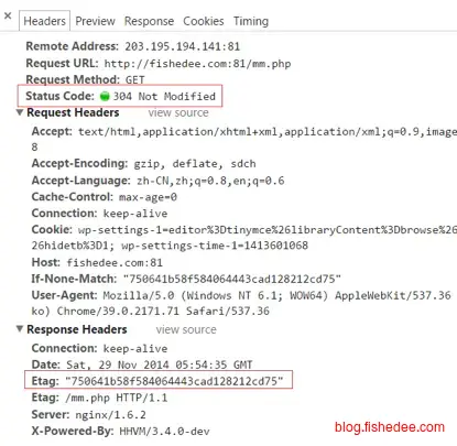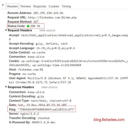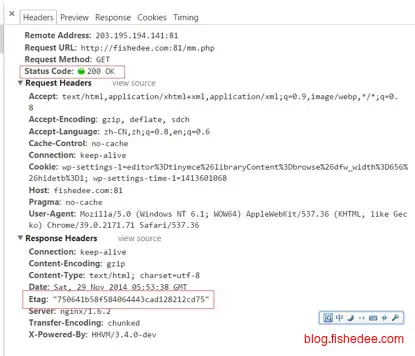 Header中包含Etag:“5d8c72a5edda8d6a:3239″标识,等于告诉Client端,你拿到的这个的资源有表示ID:5d8c72a5edda8d6a:3239。当下次需要发Request索要同一个URI的时候,浏览器同时发出一个If-None-Match报头(Http