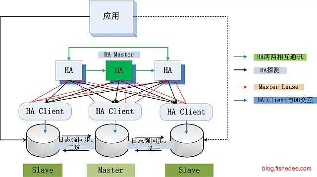 建立多个HA节点,同时间只有一个HA节点对外服务,当其中一个HA崩溃后,多个HA的选举算法会推选出一个新的HA,然后发布新的HA的IP到内网dns。主的HA则会维护多个master-slave之间的故障检测与恢复。