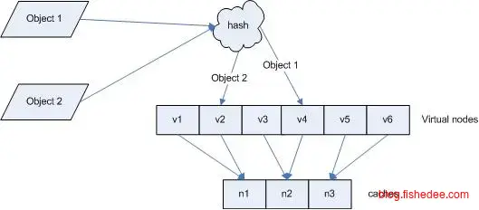 但是,当节点数量比较少时,直接的环形哈希会容易导致数据分布不平衡,相当多的数据被扔到一台机器上。解决办法很简单,引入一个虚拟层,将单个实体节点对应到N个虚拟节点上。这样当增加一台机器时,会增加N多的虚拟节点,大概均衡地将数据切成N份,导致原来的机器的数据能平均地迁移一小部分数据到这台新机器上了。这样大大地降低了迁移的成本,而且保证数据均衡分布。