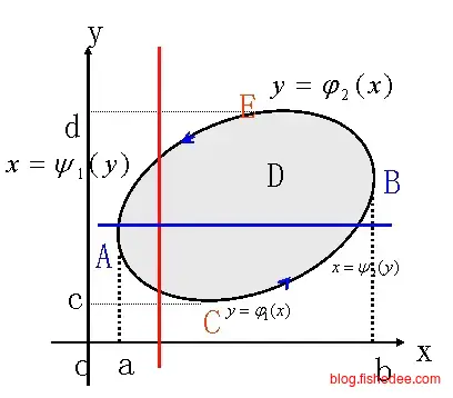的形式,其中\(\varphi_1(y),\varphi_2(y)\)在\([c,d]\)上连续,这时称区域D为Y型区域。则这个二重积分的值为
