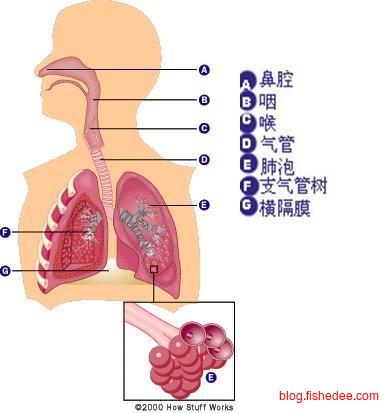 空气通过鼻腔,咽喉经过主气管进入到肺部,在肺部中经过各种分叉的支气管树,到达肺泡,由肺泡来吸收氧气排出二氧化碳。另外,支气管中有黏液和纤毛不断黏附灰尘和微生物,清除毒素。最后是,横膈肌负责带动肺部运动,让更多的空气走入肺部。