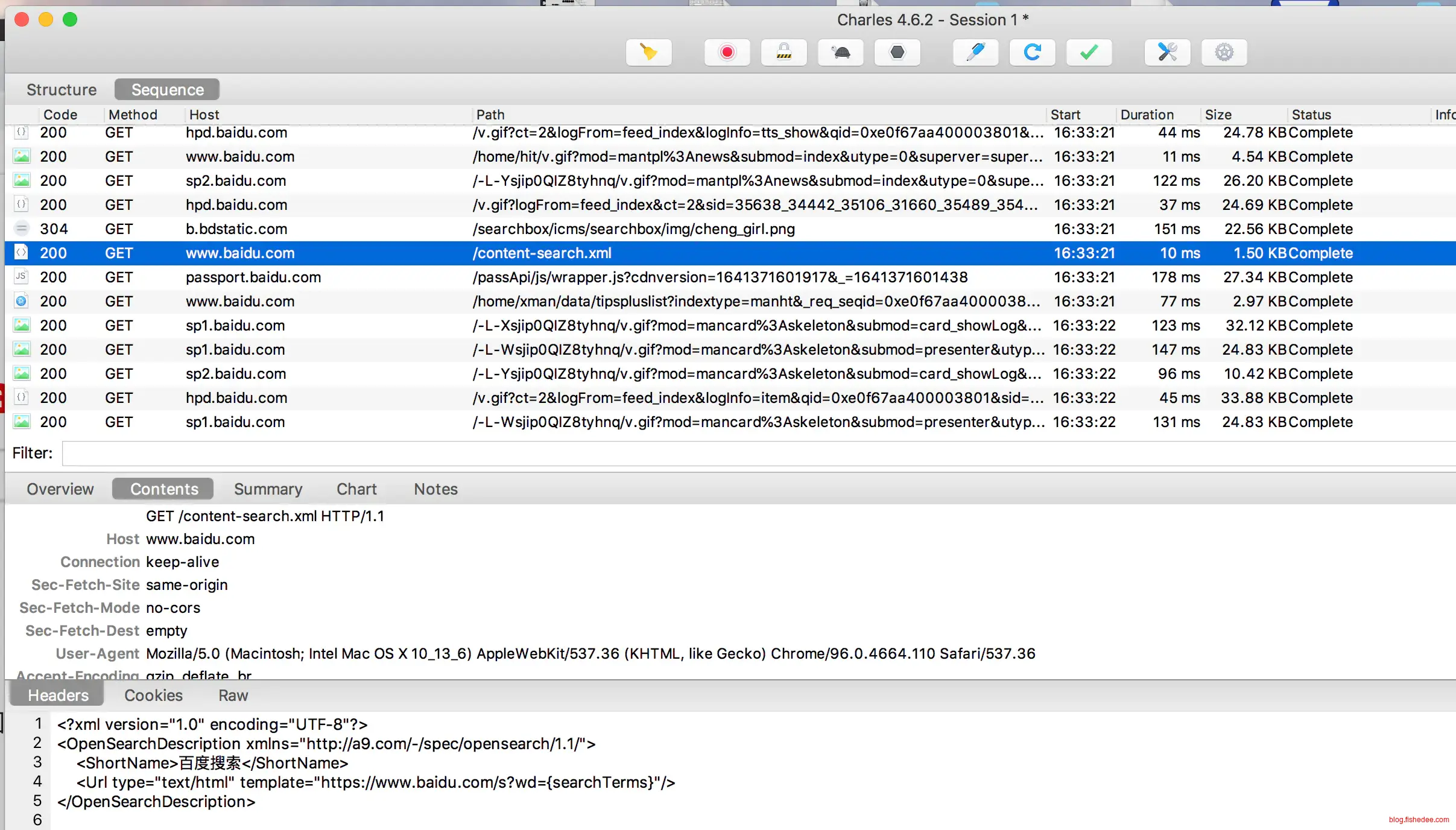 然后,随便用safari打开一个http网站,你都能在charle中看到抓包的信息了。