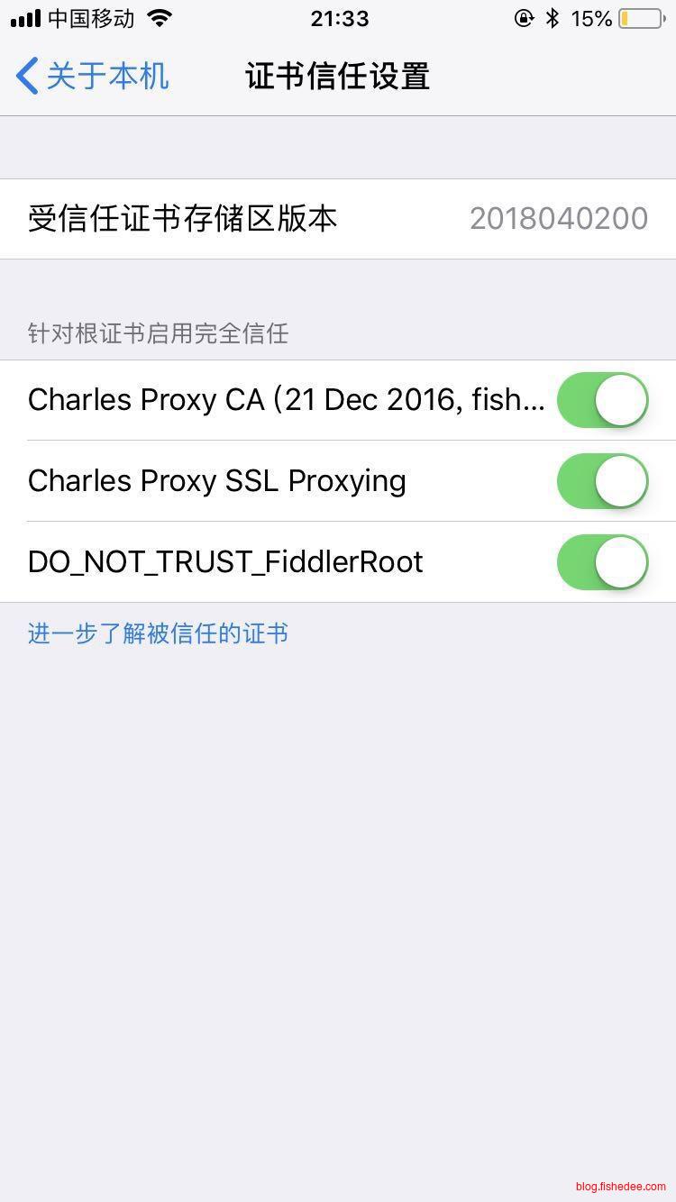 注意,以上安装了描述文件还不行,必须要这样做。打开通用,关于本机,证书信任设置,然后勾选Charles Proxy CA。