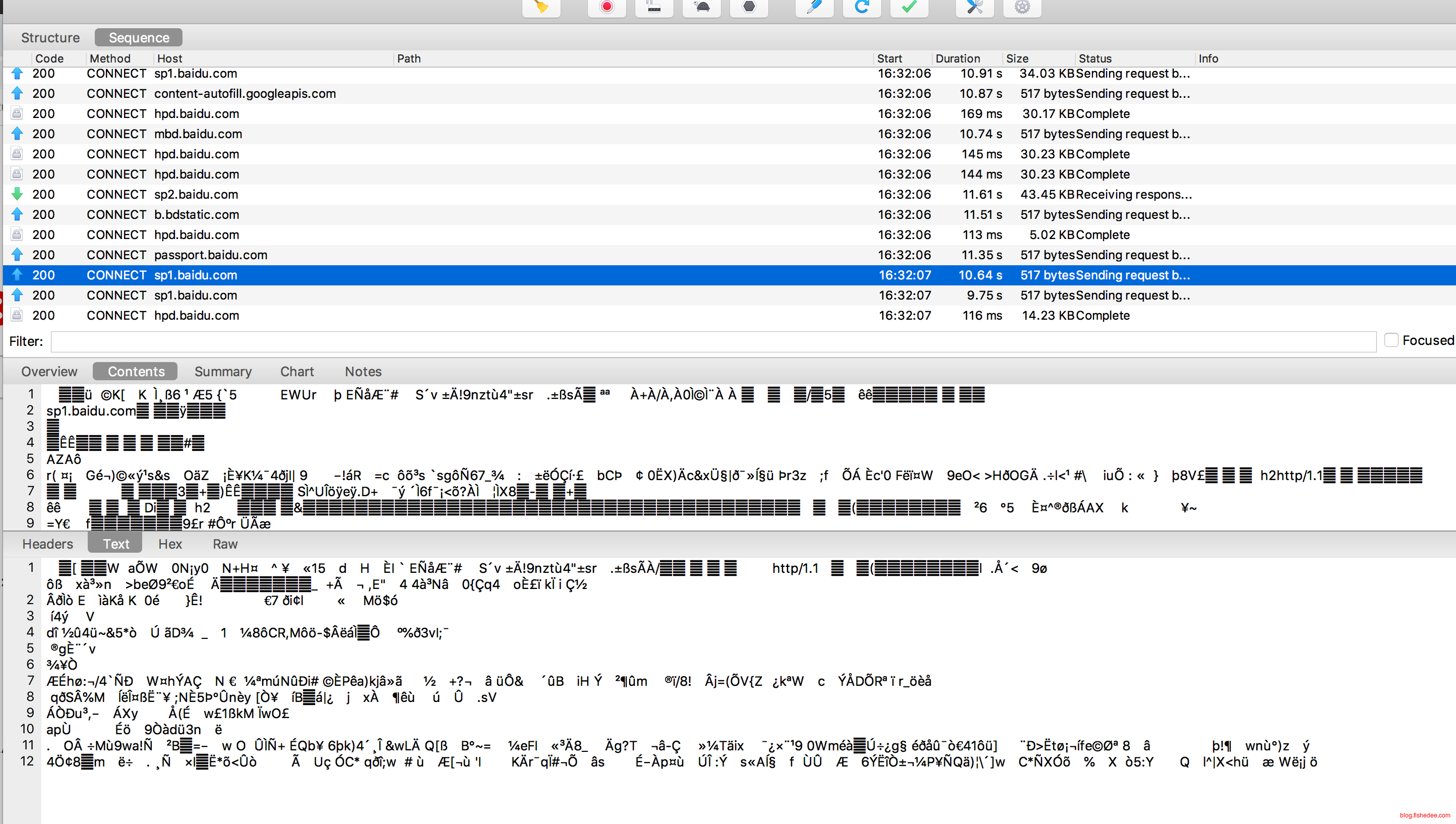 Https包透传模式下,包的数据都是乱码,看不到,请求的头部只有一个CONNECT