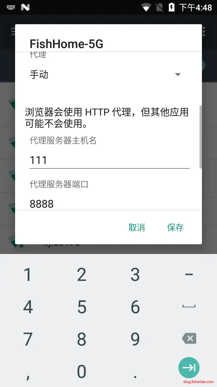 然后,打开手机连接电脑释放的wifi热点,并输入密码,然后进入配置,选择配置代理,设置手动,服务器设置为wifi热点的地址,一般是192.168.1.1,这个要和wifi热点中的路由器配置一样!,端口设置为8888就可以了。
