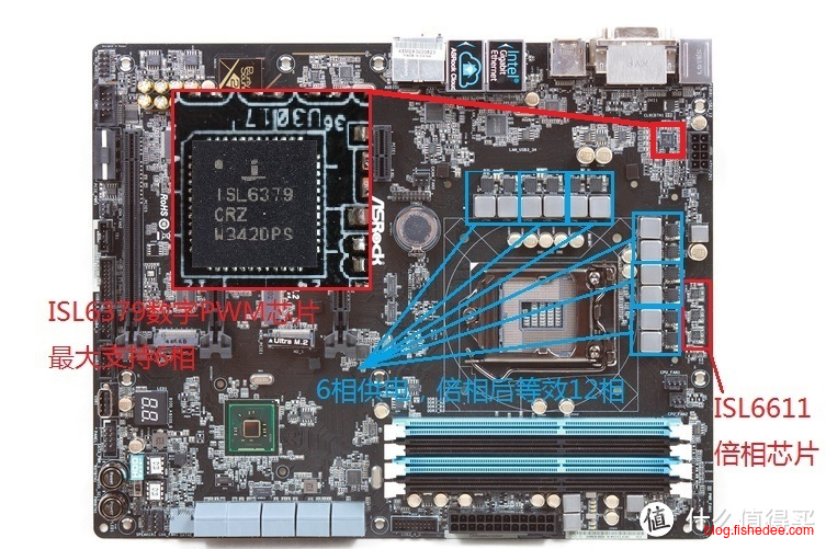PWM芯片是3相的,通过倍相芯片以后,就能变为6相供电。有倍相芯片的都是高级主板了,特征是,倍相芯片的数量刚好是旁边的MOSFET开关数量的2倍。