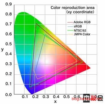 这是颜色中的色域,可以看出,最广的色域是NTSC和Adobe rgb,两者几乎相互重叠,但在边界处却有一点不同。然后更少一级的是sRGB色域。一般来说,100% srgb就属于广色域的显示器了,100%的Adobe rgb就属于专业级的显示器了。