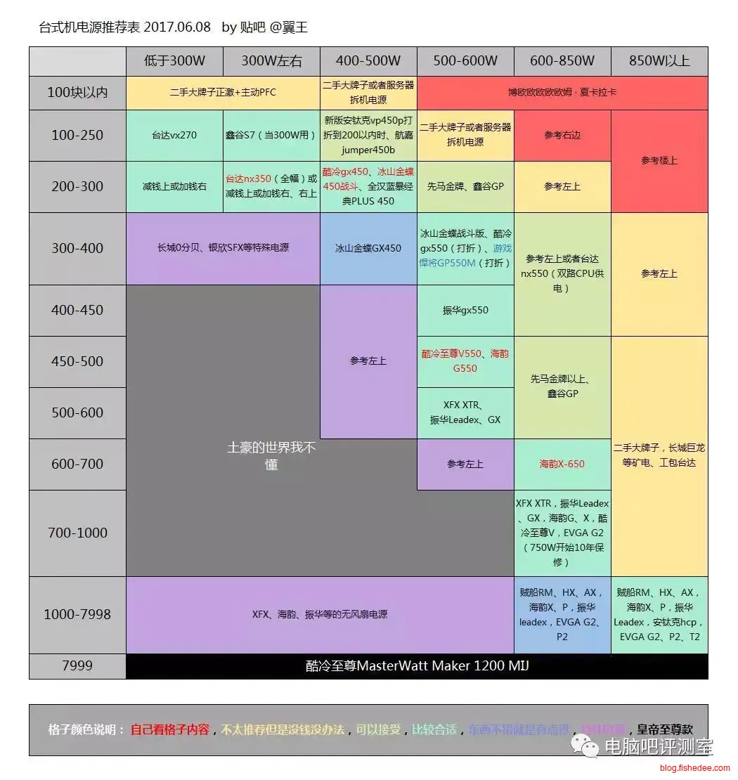 买电源时坚信一分价钱一分货,不能贪便宜买大功率低价格的杂牌电源品牌。对于中小功率电源,适合0.8元/w的价格购买,对于大功率的电源,适合1元/w的价格购买。并且在不同的功率附近需要选择不同的品牌。我之前选择的是航嘉冷静王300w的电源,199元(0.67元/w),后来需要加显卡,所以换了酷冷至尊v550的550w电源,529元(0.97元/w)。换了以后,即使功率上去了,但电源仍然比原来的电源静音多了,而且一点电流的吱吱声都没有,舒服多了。