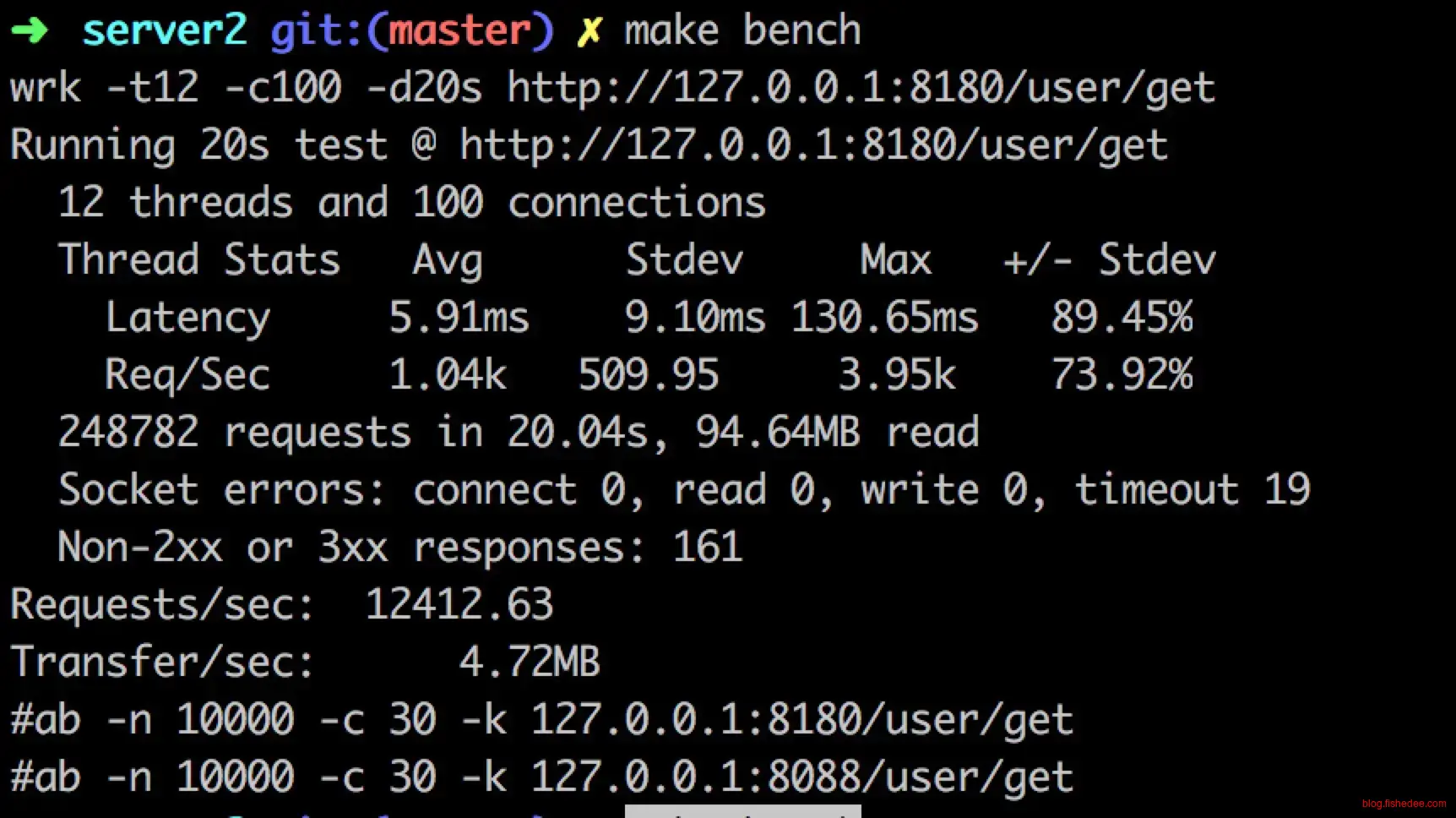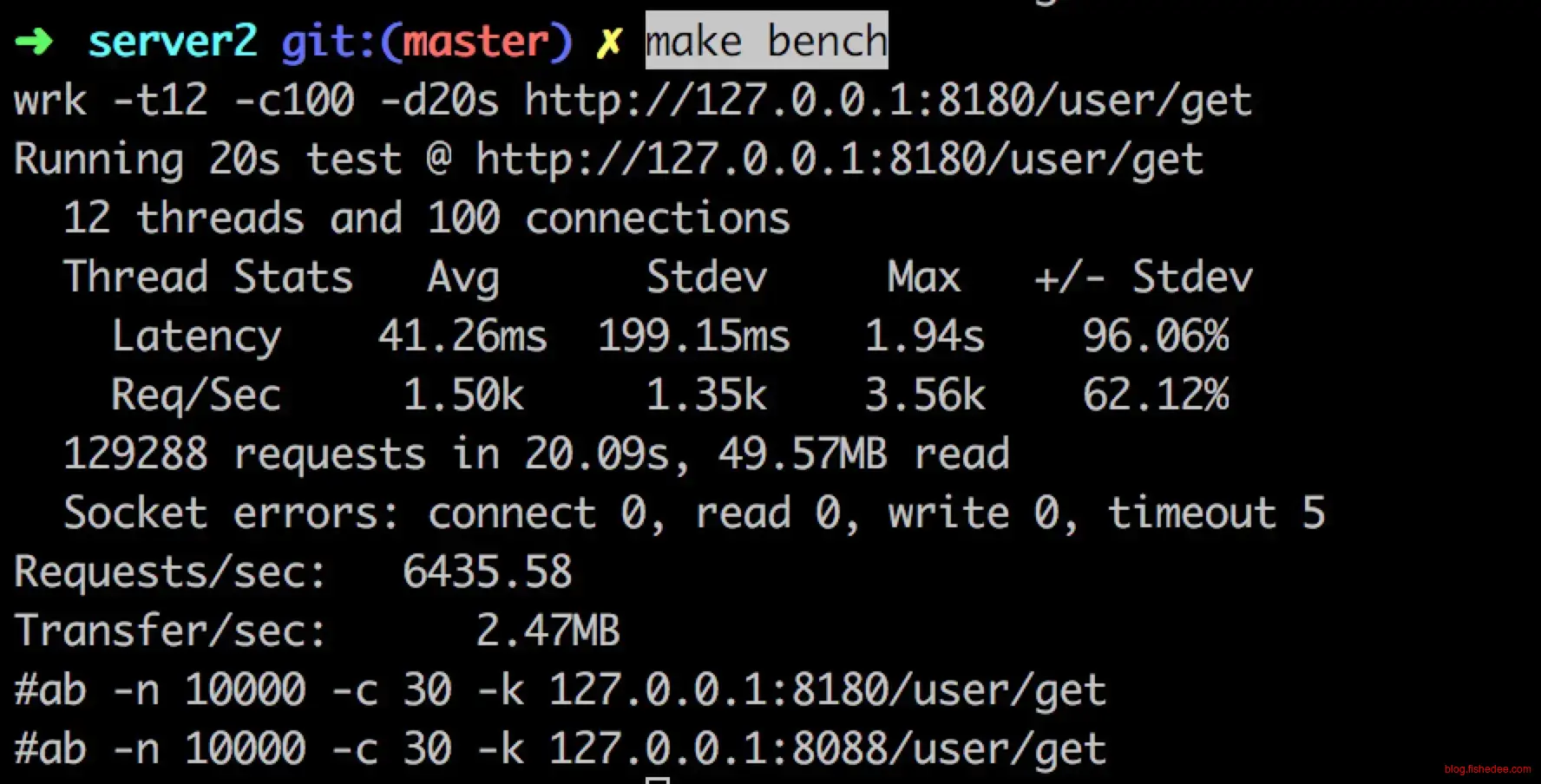 为了验证一下actix框架的性能是否真的如此变态,我在本地测试了一下MyManager的golang版本的/user/search接口的性能,6400多qps。