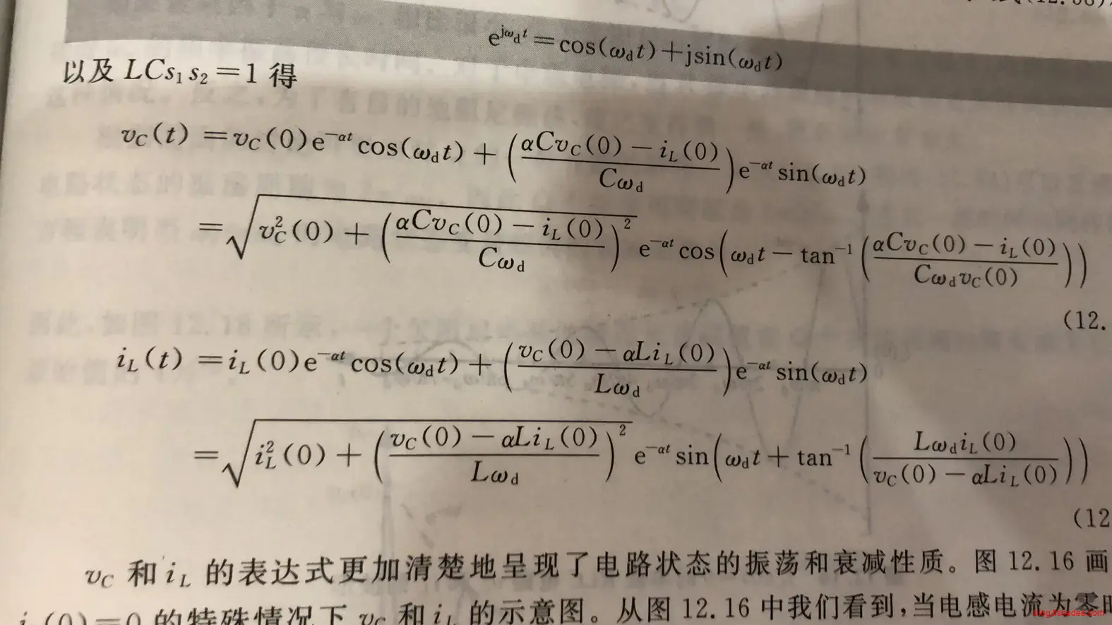 然后根据初始状态,\(v_C(0)\)和\(i_L(0)\),求得\(A_1\)和\(A_2\),最终结果为: