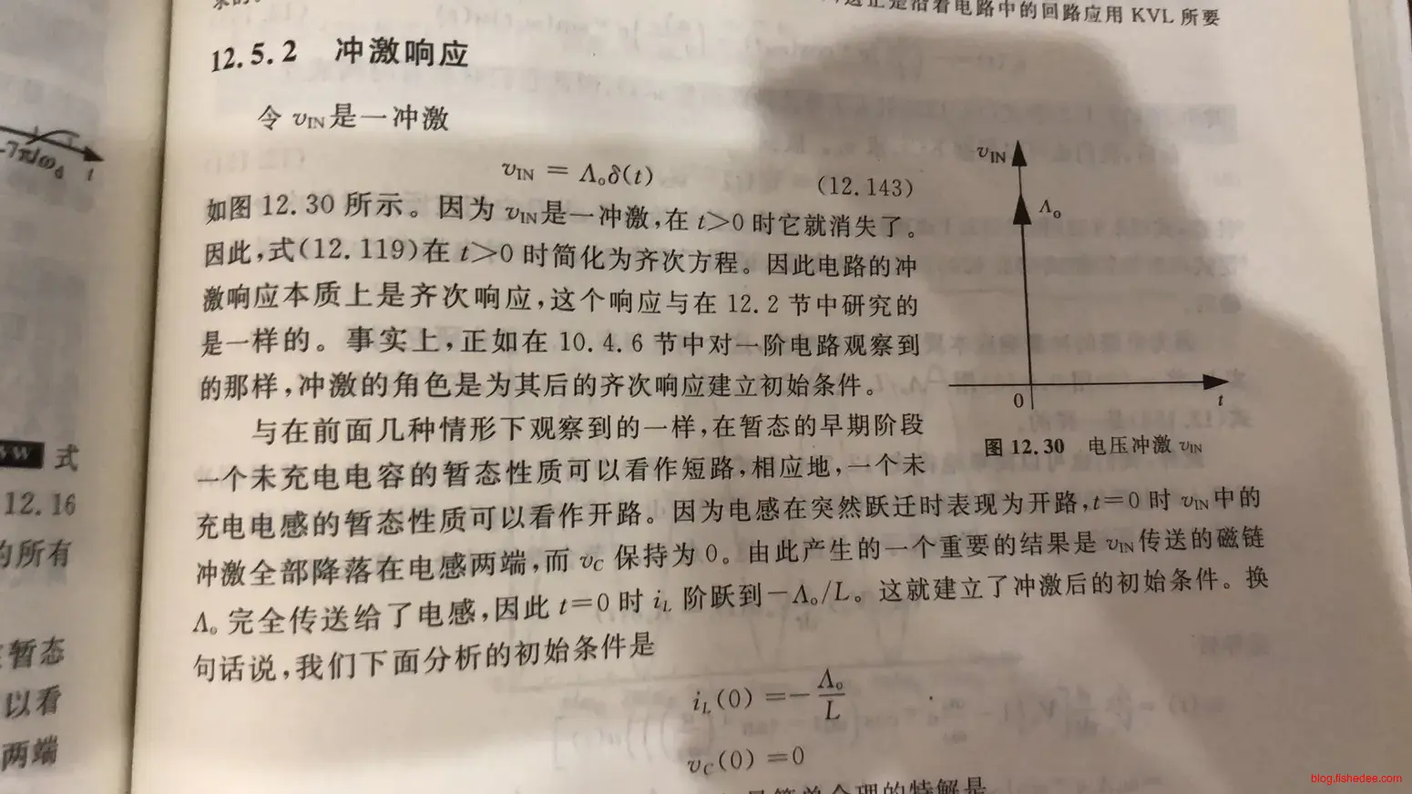 当输入是冲激输入的电压源的时候,我们做一个巧妙的类比。当冲激输入的一瞬间,相当于将所有电压源放到了电感两端。因为电感短期是开路的,电容短期是短路的。