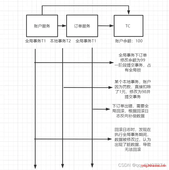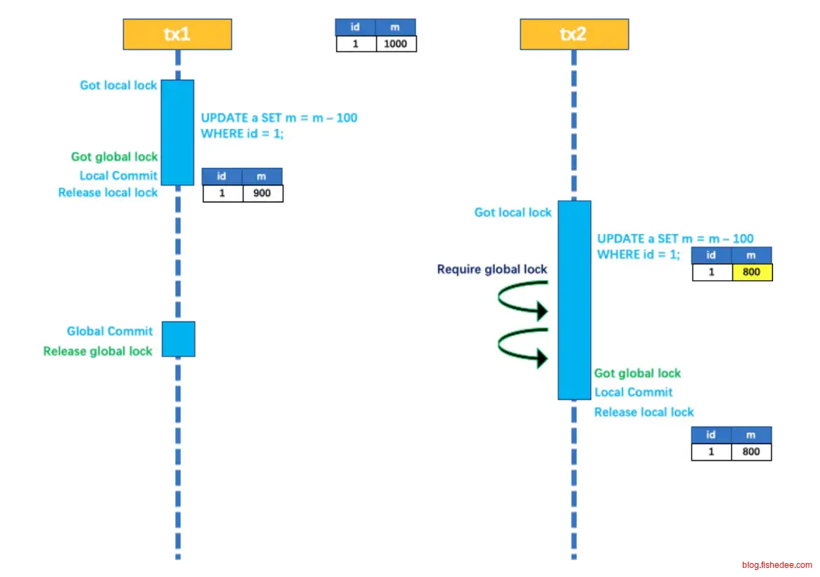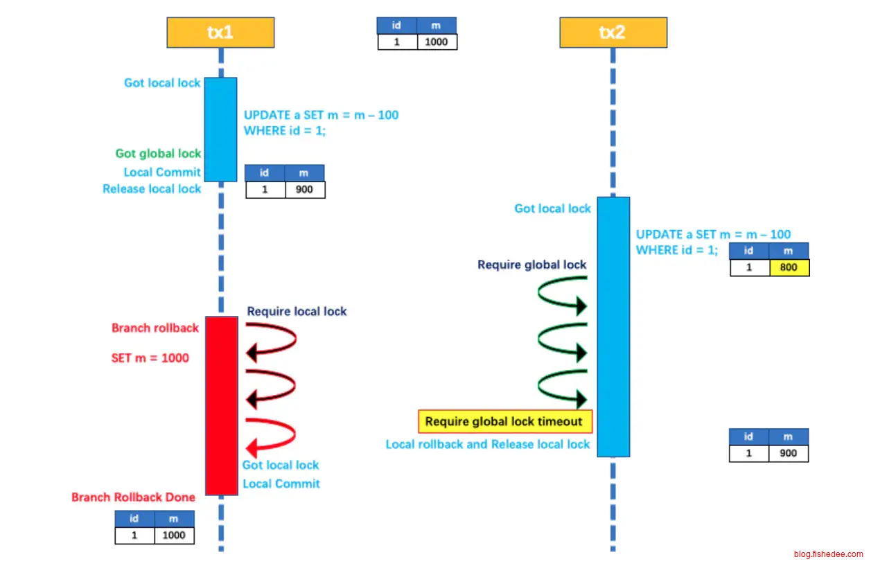 默认的本地事务无需获取全局锁就能执行,这就会造成无意中修改了正在等待commit/rollback的全局事务的行。一旦这样做的话,rollback的全局事务就无法正常回滚。