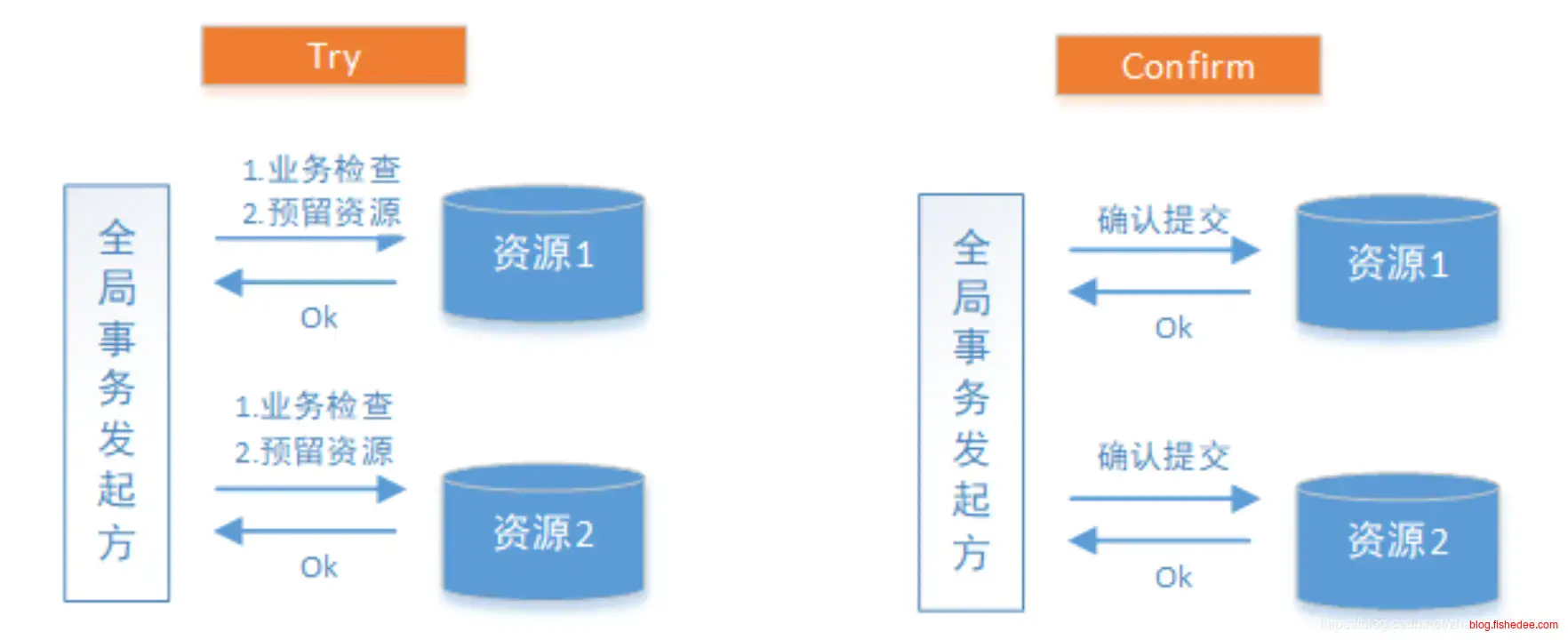 TCC模式需要由业务方提供,Try/Confirm/Cancel的三个业务方法。Saga模式只需要由业务方提供,Normal(一阶段正向服务)/Compensate(二阶段补偿服务)的方法,它的想法相当直观,就是以顺序链的方式依次执行每个本地事务,如果其中一个失败的话,就反向补偿前面已经成功的业务。