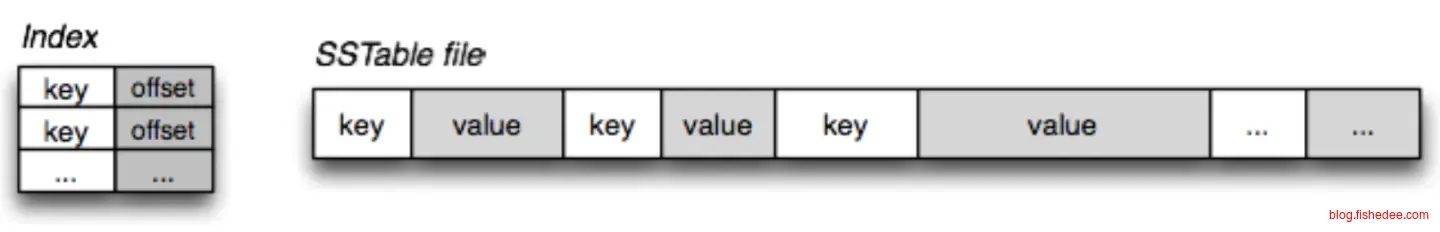 SSTable,有序键值对文件。并附带一个稀疏索引,Index数组。为什么是稀疏,因为Index数组不需要存所有key的数据,存一部分的key数据就可以了,根据key的有序性我们能知道到它在Data数组的偏移量区间。
