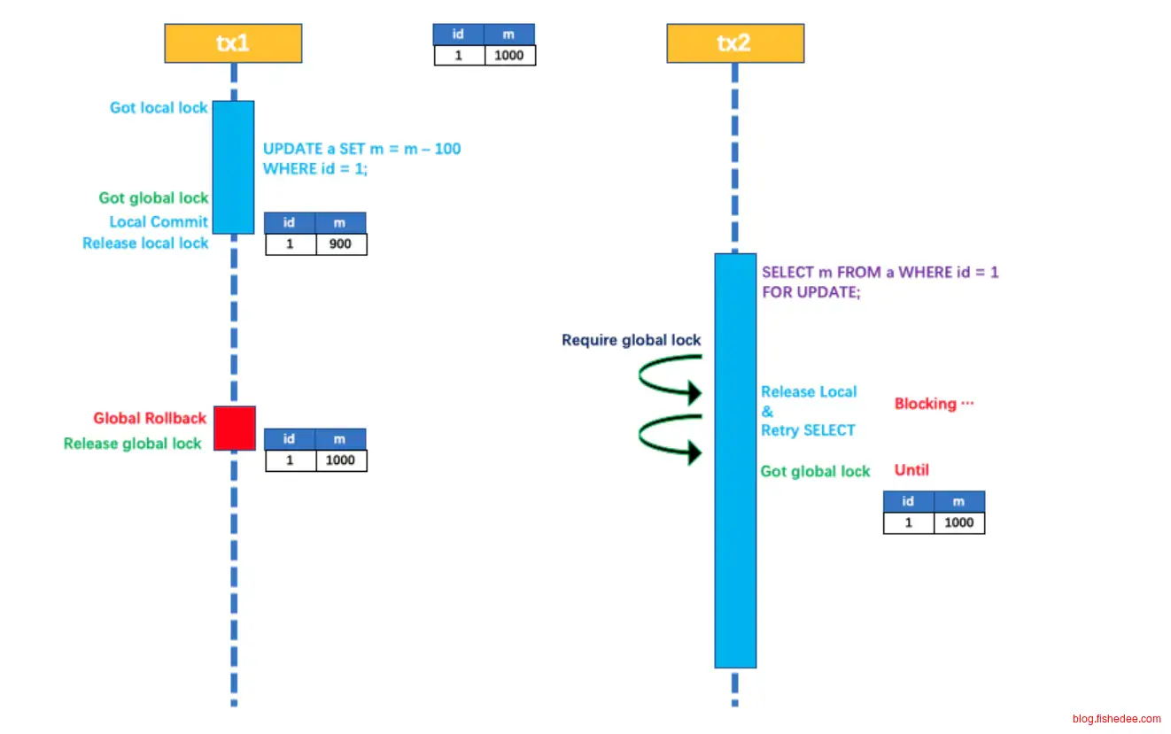 | 提交tx1的第二阶段 | commit阶段,释放锁,事务完成 | tx2立即获得行锁,然后更新m为800 | commit阶段,释放全局锁(本地锁在prepare阶段就释放了),事务完成 | prepare阶段立即获得全局锁,并释放本地锁 |