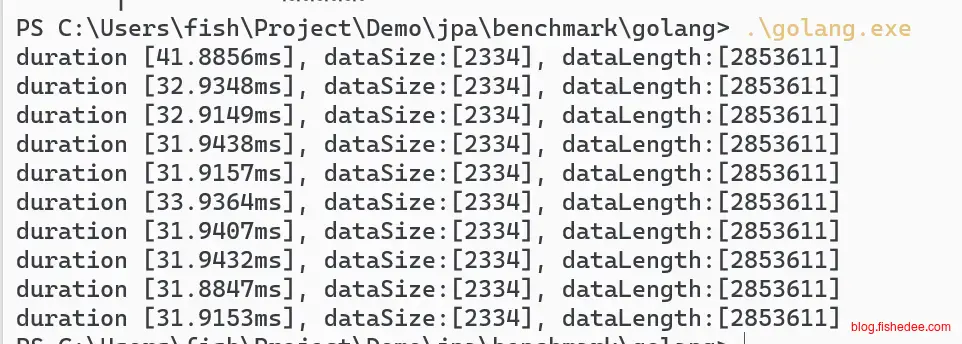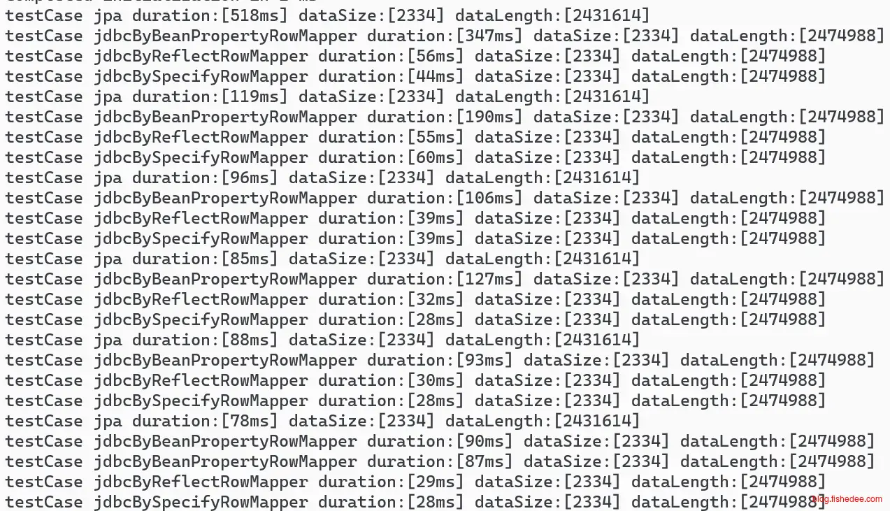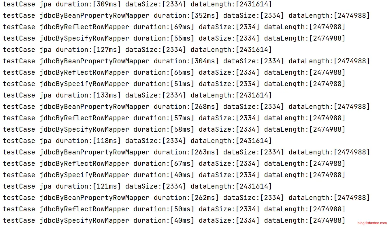 通过打包以后,重新启动jar文件,这个时候的是发布模式。可以看到,性能有了大幅的提高,jpa性能大概为78ms,jdbc性能为30ms,总体而言,jpa的获取数据依然有较大损耗,大概为jdbc的反射版本2倍有多。jdbc的BeanPropertyRowMapper性能非常差,大概为jdbc的反射版本的3倍。java的总体拉取性能和golang基本上是一致的,没什么区别。
