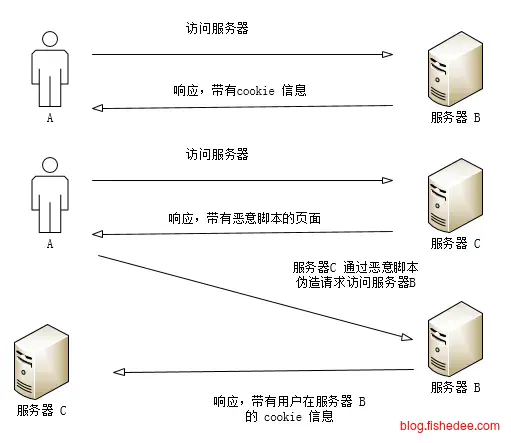 他的攻击在于,在A网站,可以发送到B网站的跨域请求,但是这个请求只能发送,不能获取结果的。在普通的浏览器上,跨域请求都会附带跨域的Cookie,例如A网站请求B网站的请求时,该请求附带B网站的Cookie,并且会被B网站的服务器处理。浏览器仅仅是不允许A网站读取该跨域请求的返回结果而已。