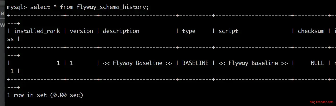 然后就会数据库中创建一个flyway_schema_history表,并且默认的版本号为1。显然,如果下次执行migration的话,就会将1.0之后的迁移脚本都执行一遍。
