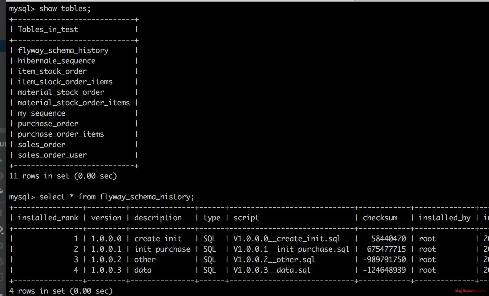 - 如果当前数据库是空的,且没有flyway_schema_history,那么就会创建flyway_schema_history,它里面会保存每个脚本的执行情况,以及当前的数据库版本号。
