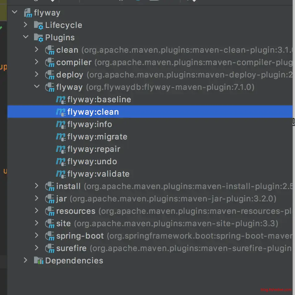 </plugin>flyway的Maven插件支持,它的功能是允许在IDE中进行直接调用flyway的命令。注意flyway的插件配置,不是自动读取application.properties的内容,需要另外在configuration里面配置的。