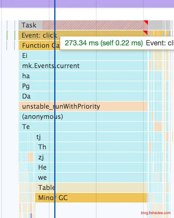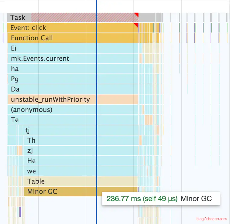 但要注意Chrome Dev Tools自身的开销并不少。一个例子,在进行Chrome Dev Tools开启了Memory的多个测试以后,再进行Performance测试,会发现,MinorGC占比高达80%的开销。由于网页的Memory只有30MB,不太可能会产生这么长时间的GC停顿,所以,问题只能归结于,Chrome Dev Tools在自身进行Memory测试以后产生巨大的内存占用导致的。另外,关闭Chrome Dev Tools标签,再重新打开后,该GC停顿也会随之而消失。