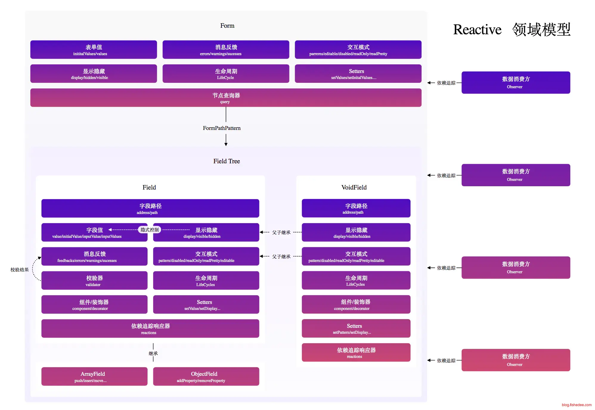 - ViewModel提供了额外的生命周期(onMount,onInit,onUnmount,onSubmit,onFieldChange,onFieldReact),虚拟属性访问(实际是get与set方法),属性设置与获取的方法(setValuesIn,getValuesIn),公开的可调用方法(onInput,onFocus,onBlur)。这些方法的底层其实都在操控底层的obserable对象,同时嵌入业务固定的业务数据流。例如,onInput的调用总是会触发validator的检查,submit的调用总是会触发validator的检查,对visible设置为none总是会对value设置为undefined,对required这个虚拟属性设置为true,就会对validator属性添加一个required的校验器对象,等等。