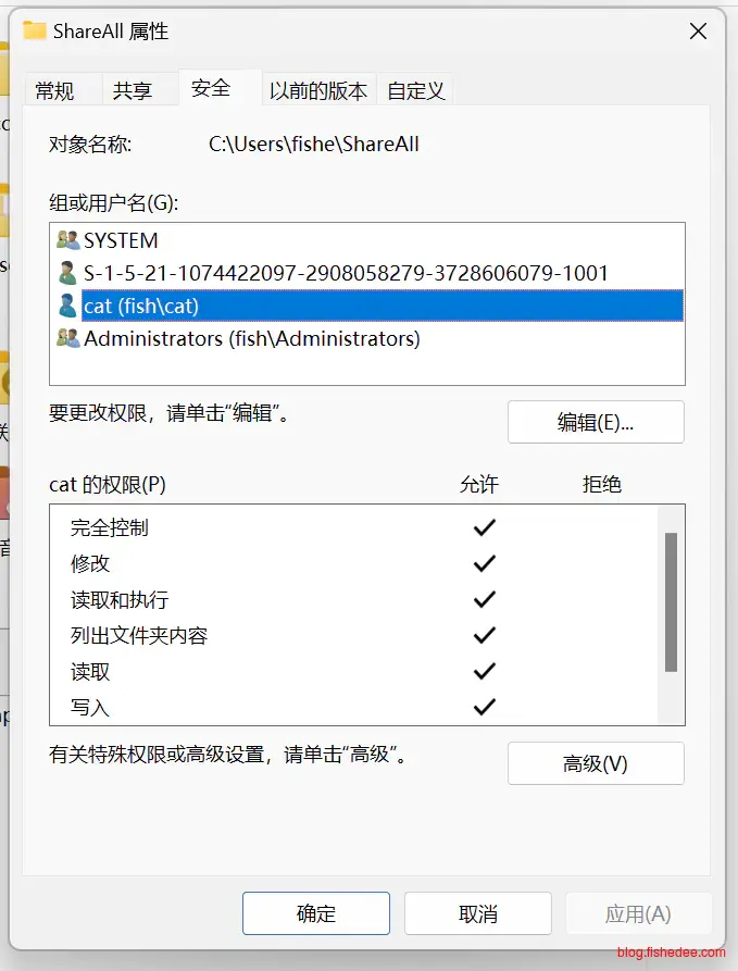 创建一个ftp文件夹,然后右键属性,选择安全。添加cat用户,将读写权限都勾选上去。如果你需要匿名登录的话,就将everyone权限添加上去