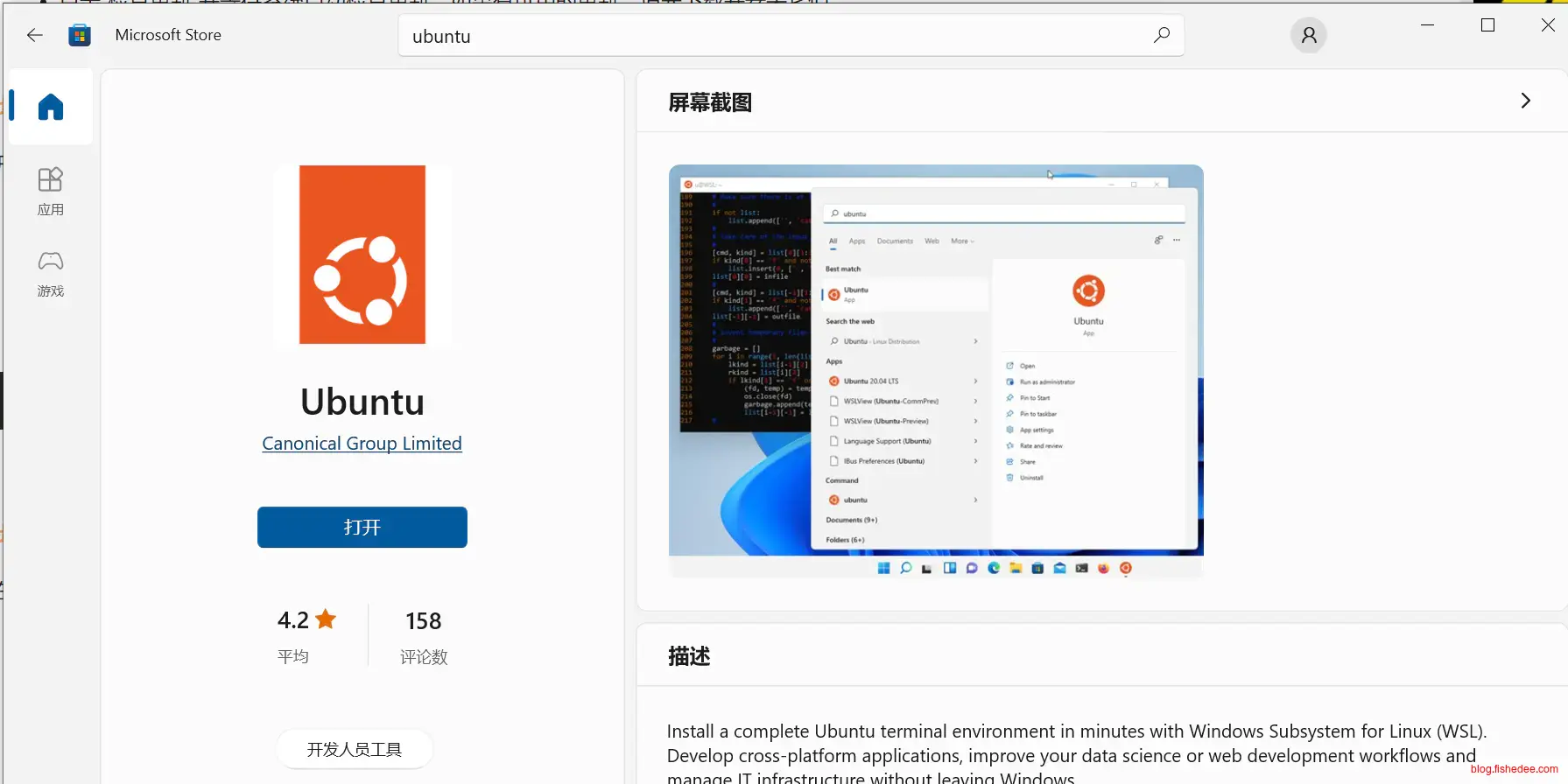 在Mircrosoft Store,输入Ubuntu,安装WSL下的Ubuntu的发行版。下载完毕以后,点击打开,初始化的时候时间久一点,然后输入账号和密码就可以了