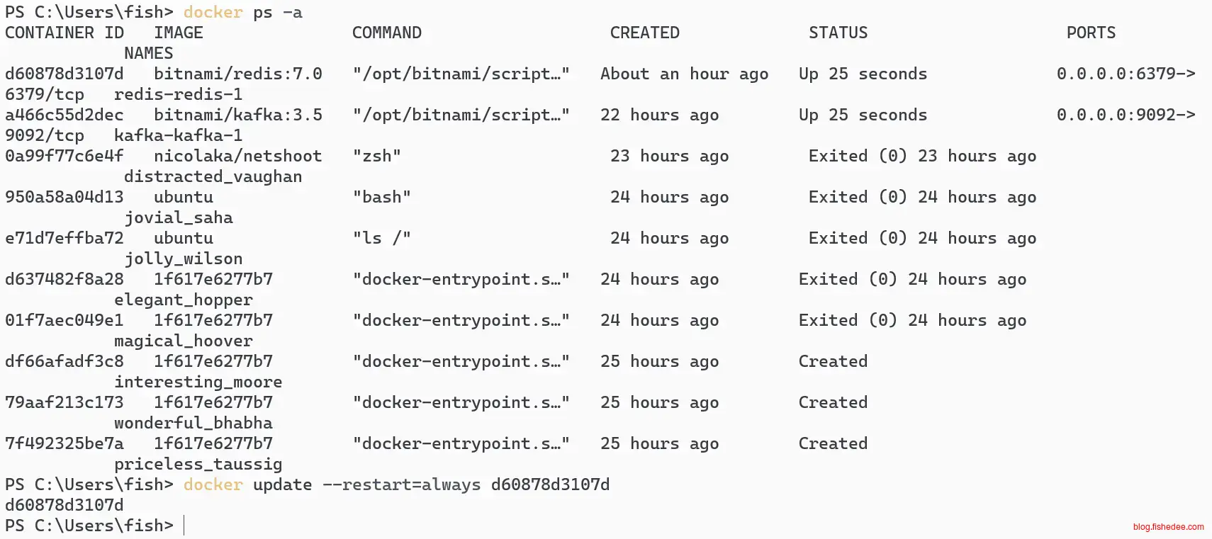 docker update --restart=always d60878d3107ddocker update用来更新docker run的参数,其中的–restart=always参数可以保证当容器掉线的时候自动重启,而且当docker启动的时候,也能启动这些容器。我们可以先用docker ps -a获取当前所有的容器,然后再指定启动。