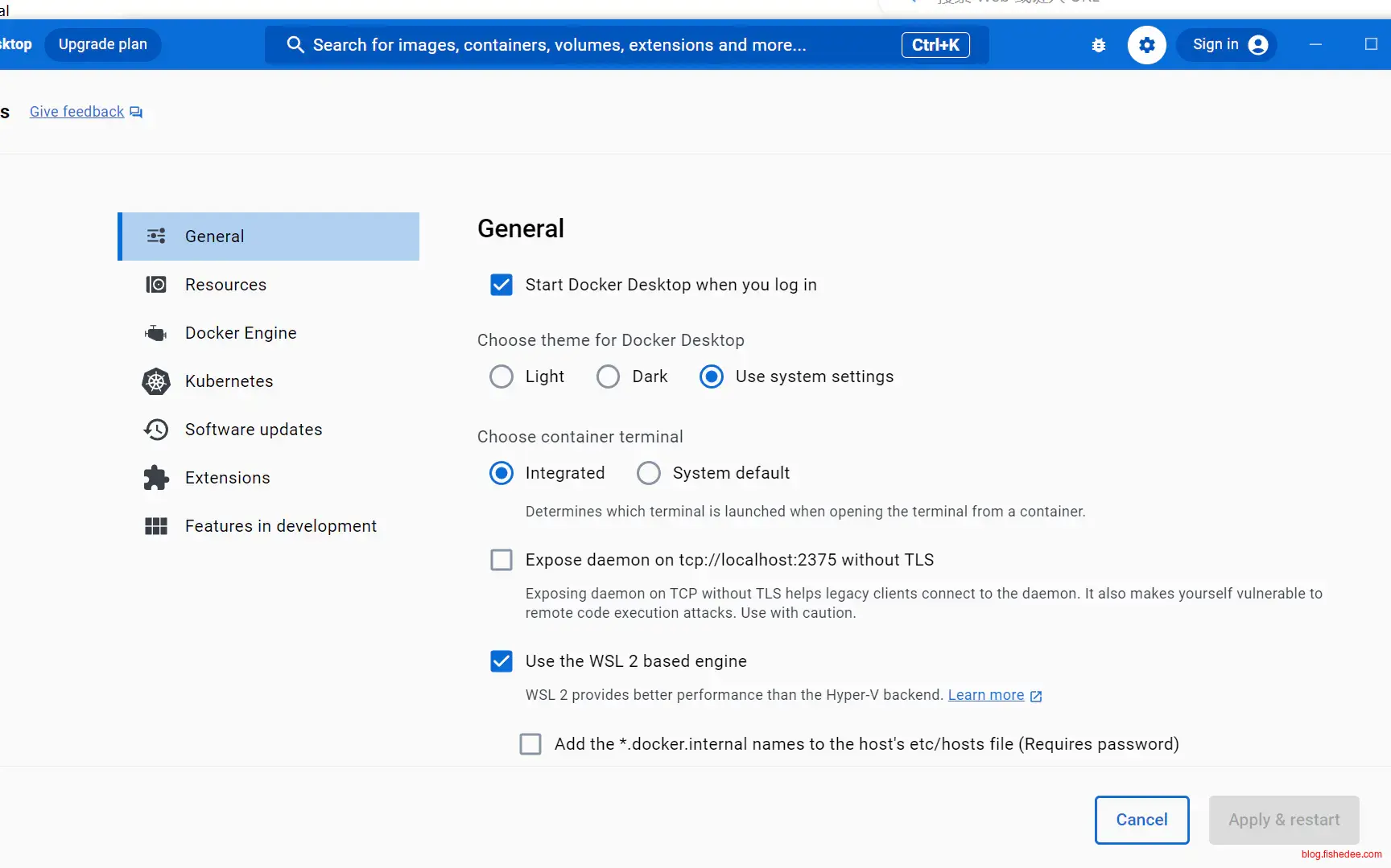 安装完毕以后,打开Docker Desktop.exe,选择设置->开机自启。