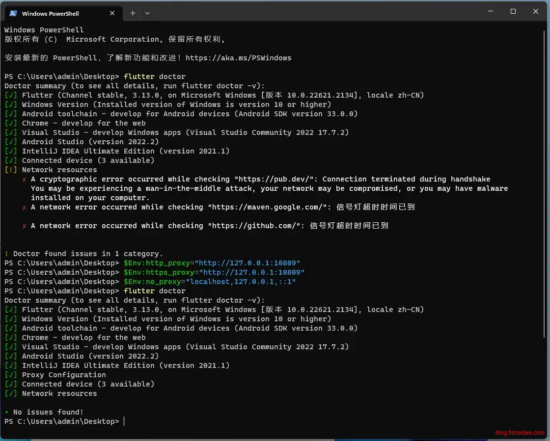有时候,配置了镜像地址还是失败,这是因为flutter向github请求的时候失败了,这个时候需要配置代理,在命令行输入以上代码即可,配置为你对应的代理地址。