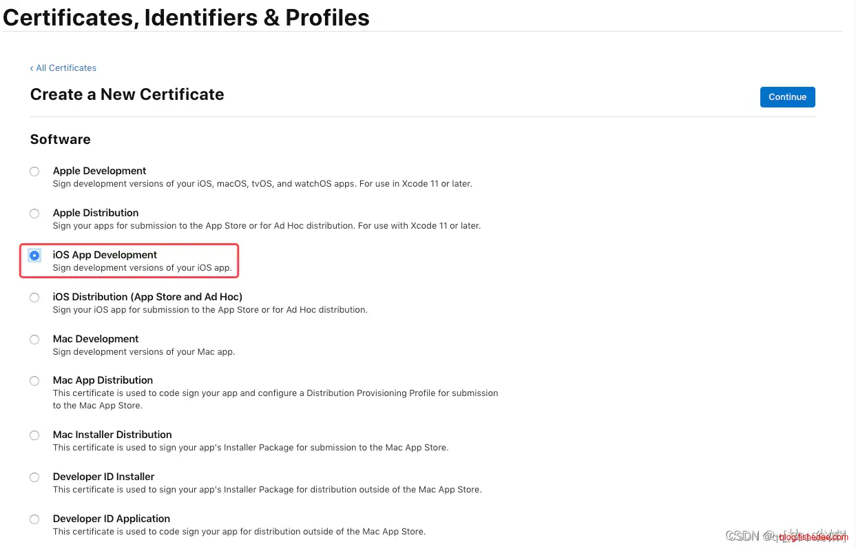 在 “Software” 栏下选中 “iOS App Development” 然后点击 “Continue”
