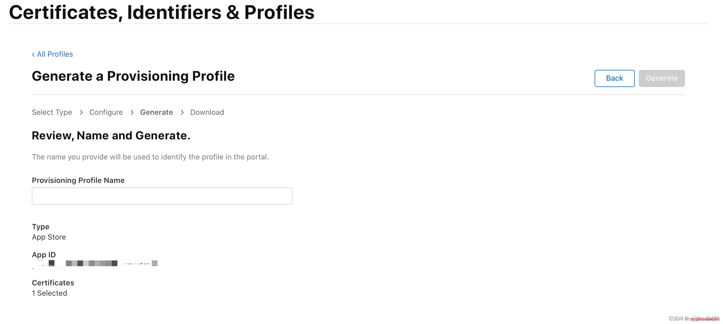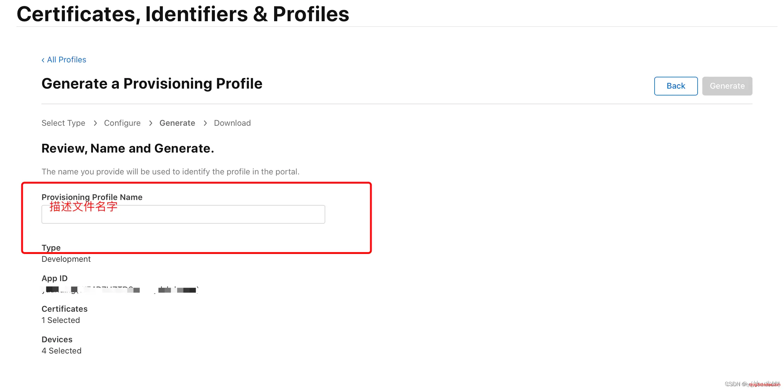 接下来输入描述文件的名称, 点击 “Generate” 生成描述文件: