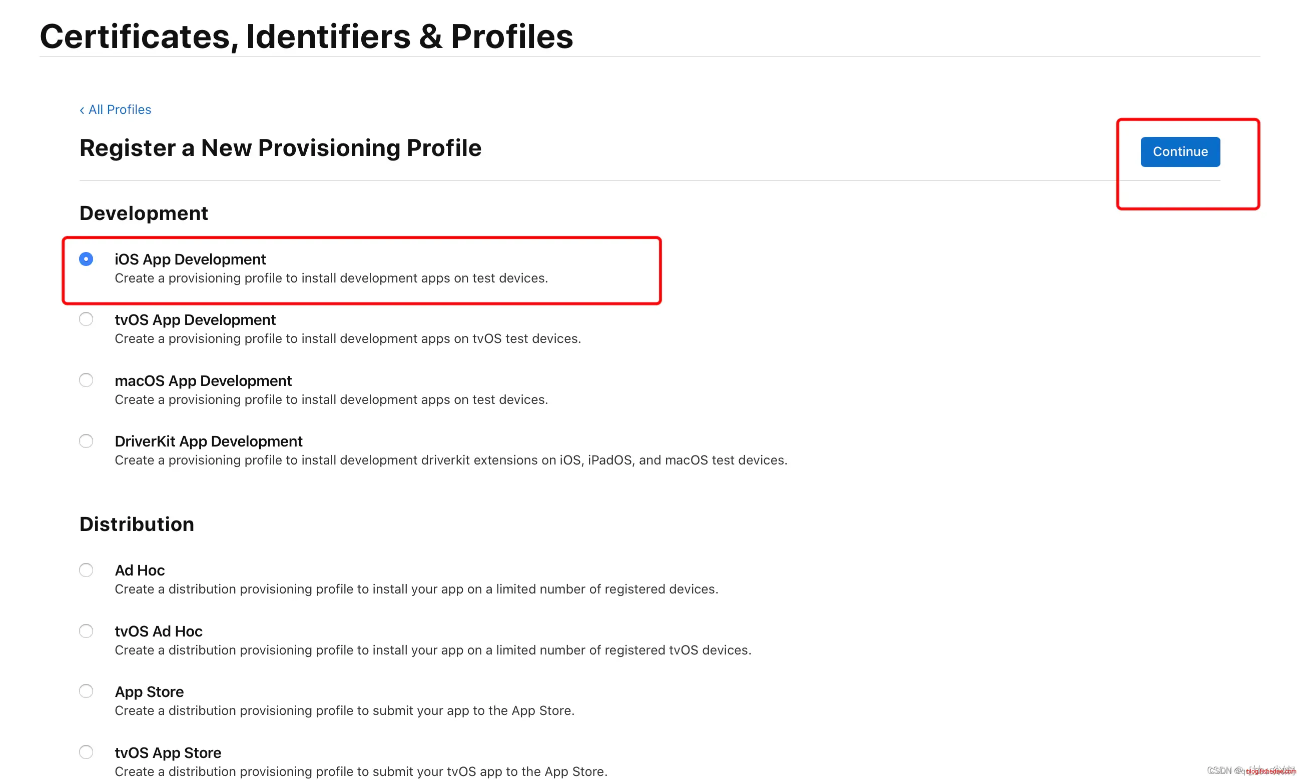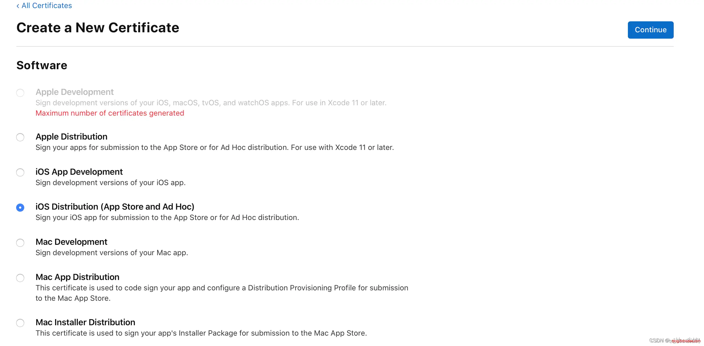 在 “Software” 栏下选中 “App Store and Ad Hoc”,点击 “Continue”
