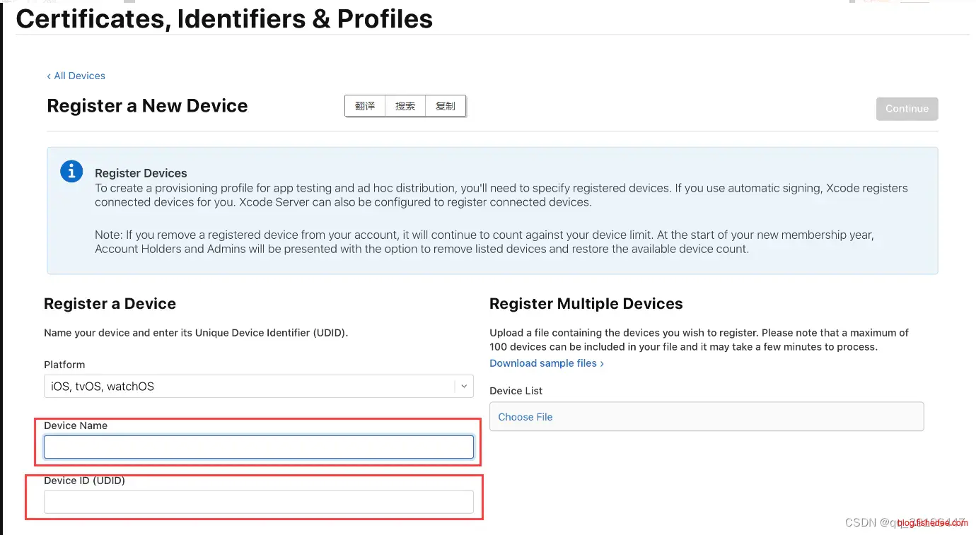 获取设备的udid(最便捷的方式):打开蒲公英,一步快速获取 iOS 设备的UDID 手机扫描二维码根据提示操作 确定之后确定信息点击“Continue” 即可在Devices列表里面看到刚刚创建的