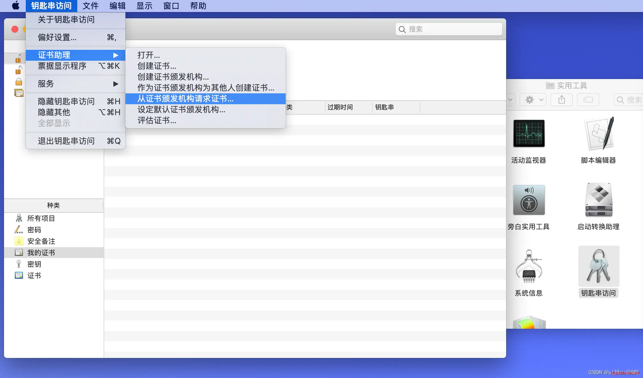 打开“应用程序”->‘实用工具’->‘钥匙串访问’->‘证书助理’,选择‘从证书颁发机构请求证书’