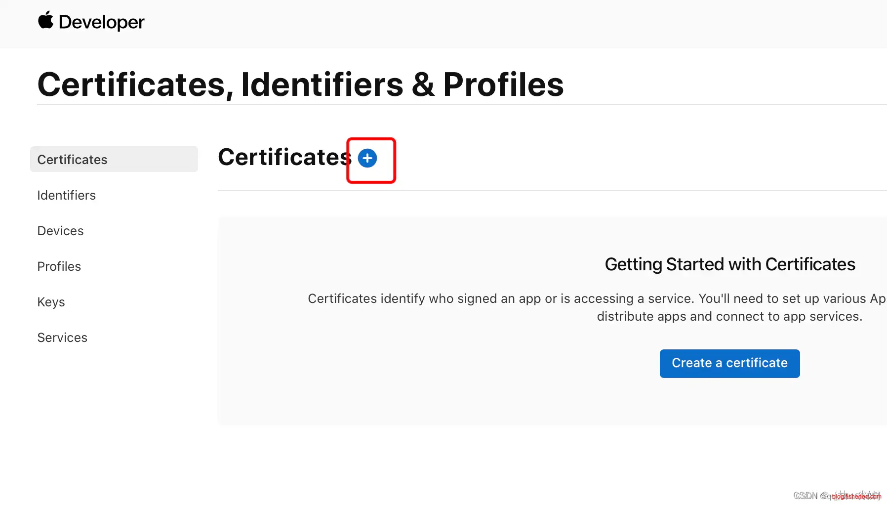 在证书管理页面选择 “Certificates” 可查看到已申请的所有证书(Development 为开发证书,Distribution为发布证书),点击页面的加号来创建一个新的证书