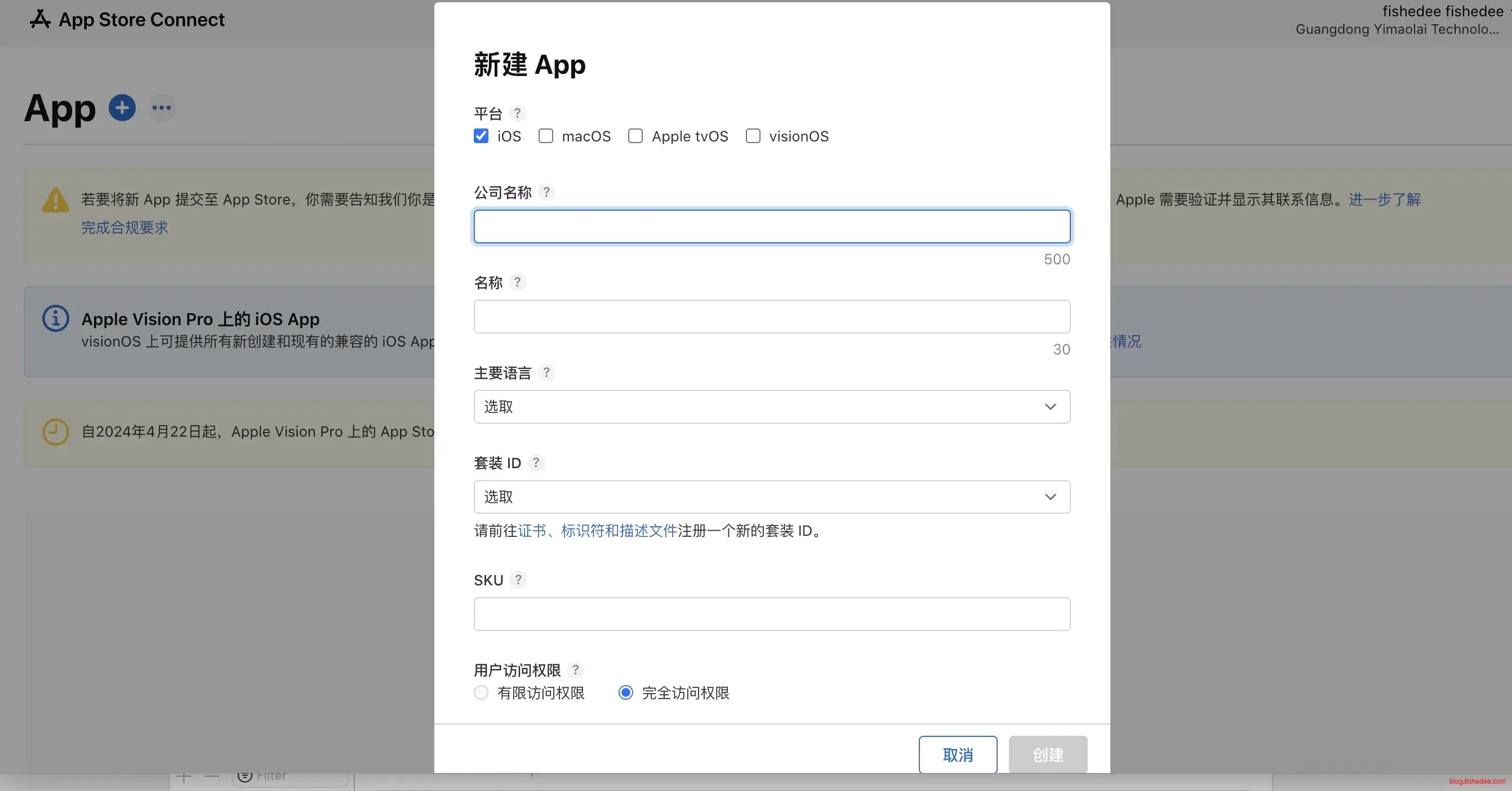 选择加号,新建App,填写相关信息,注意这里的BundleID必须要写对