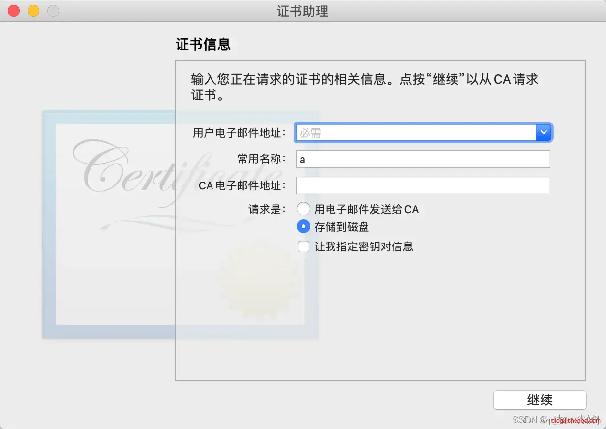 选择“存储到磁盘”,继续,这样我们就得到csr文件。它的文件名一般为“CertificateSigningRequest.certSigningRequest”
