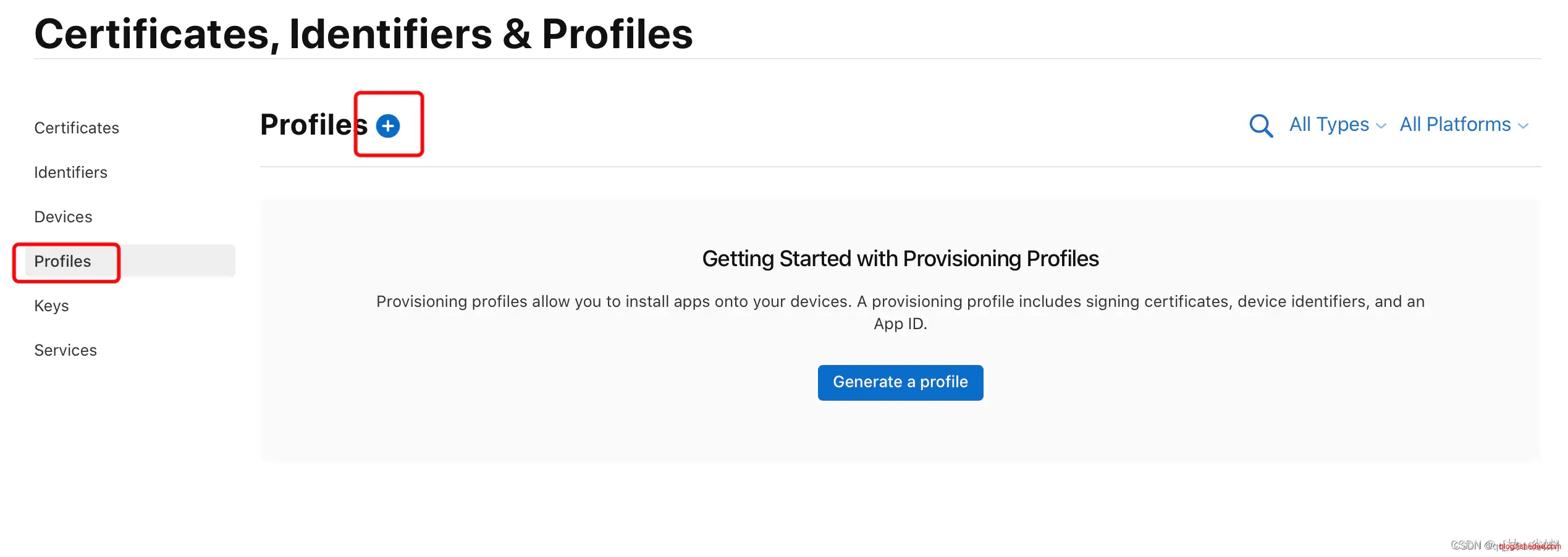 在证书管理页面选择 “Profiles”,可查看到已申请的所有描述文件,点击页面上的加号来添加一个新的描述文件: