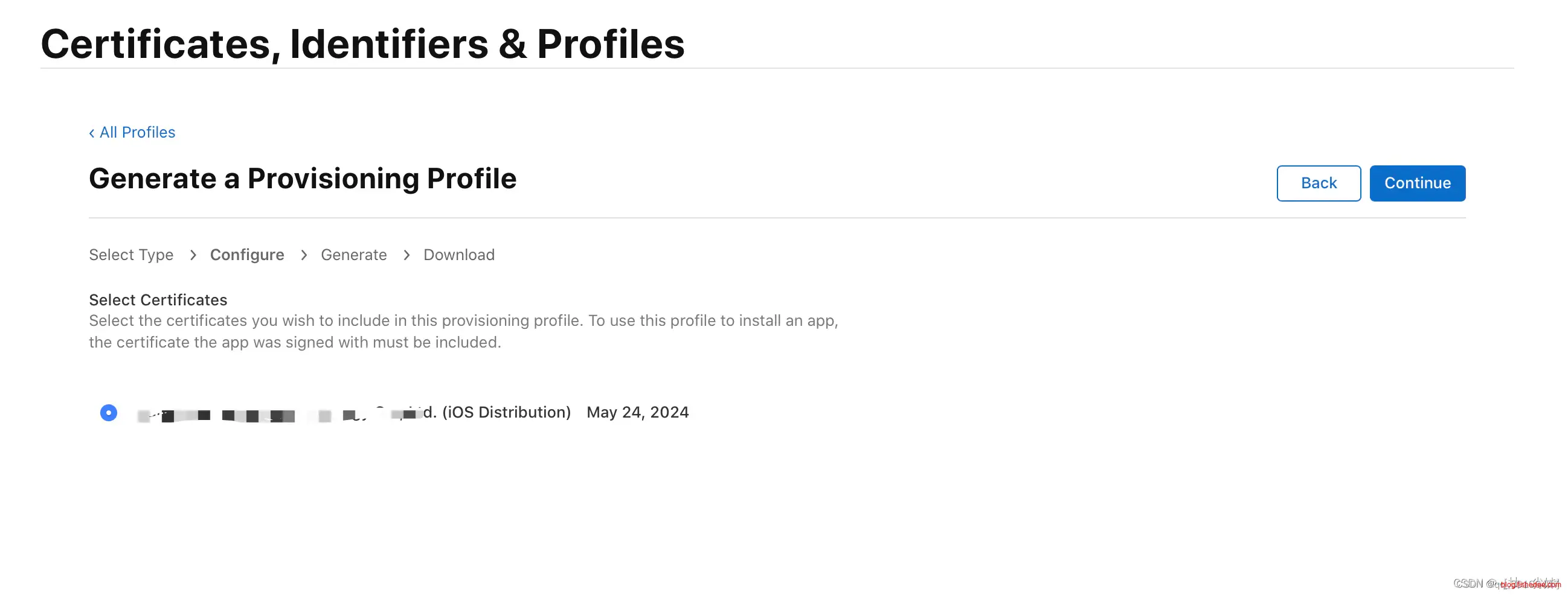 接下来选择需要绑定的发布证书(iOS Distribution),这里勾选刚刚生成的发布证书”,点击“Continue”: