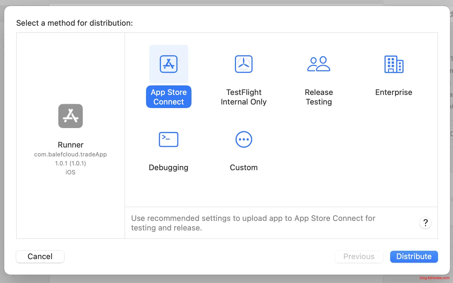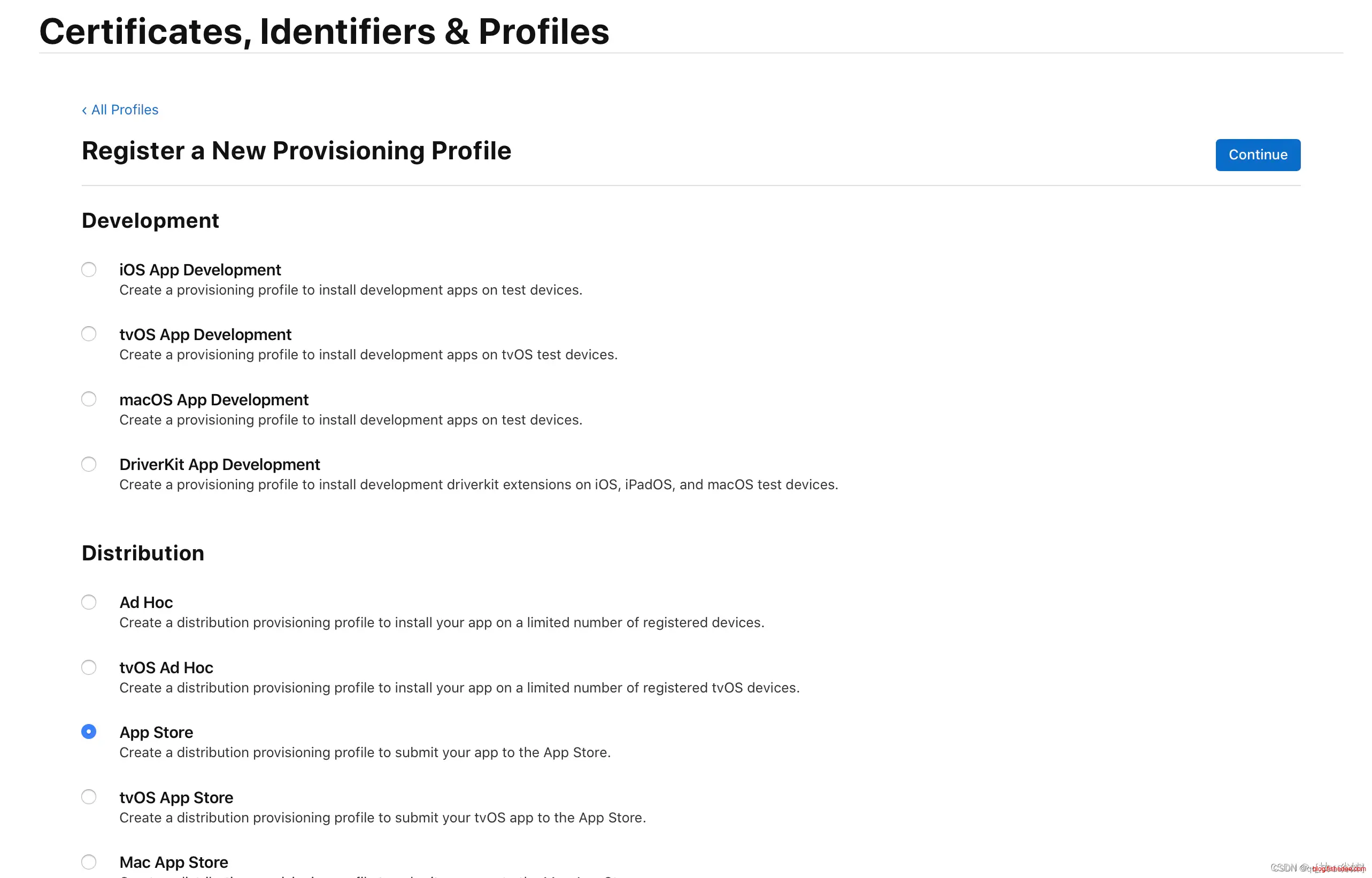 在 “Distribution” 栏下选中 “App Store”,点击“Continue”按钮:
