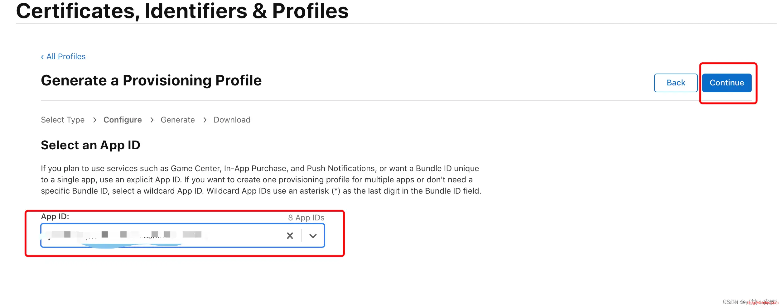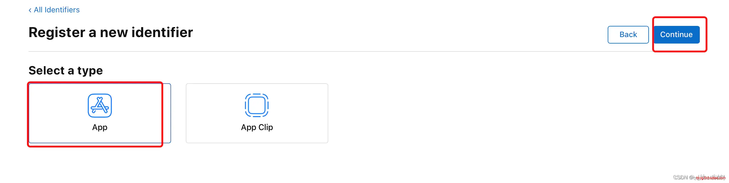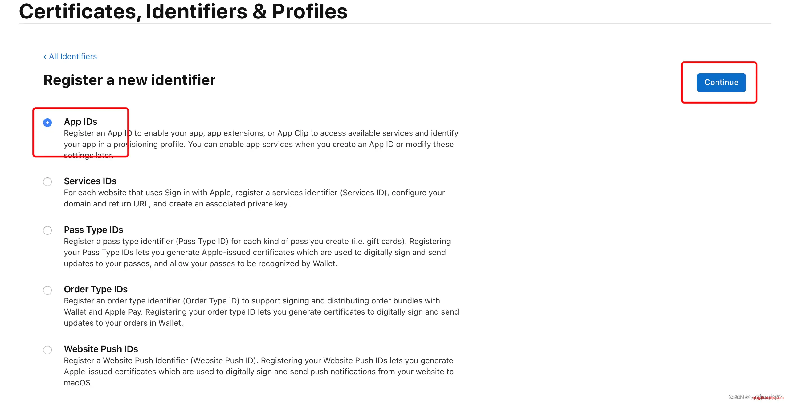 选择标识类型为 “App IDs”,然后点击 “Continue”