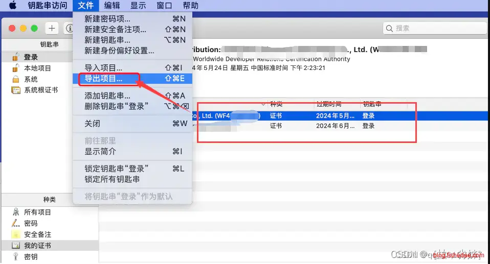 双击保存到本地的 ios_development.cer 文件,会自动打开 “钥匙串访问” 工具说明导入证书成功,可以在证书列表中看到刚刚导入的证书,接下来需要导出 .p12 证书文件,选中导入的证书,右键或者顶部文件点击选择 “导出…”: