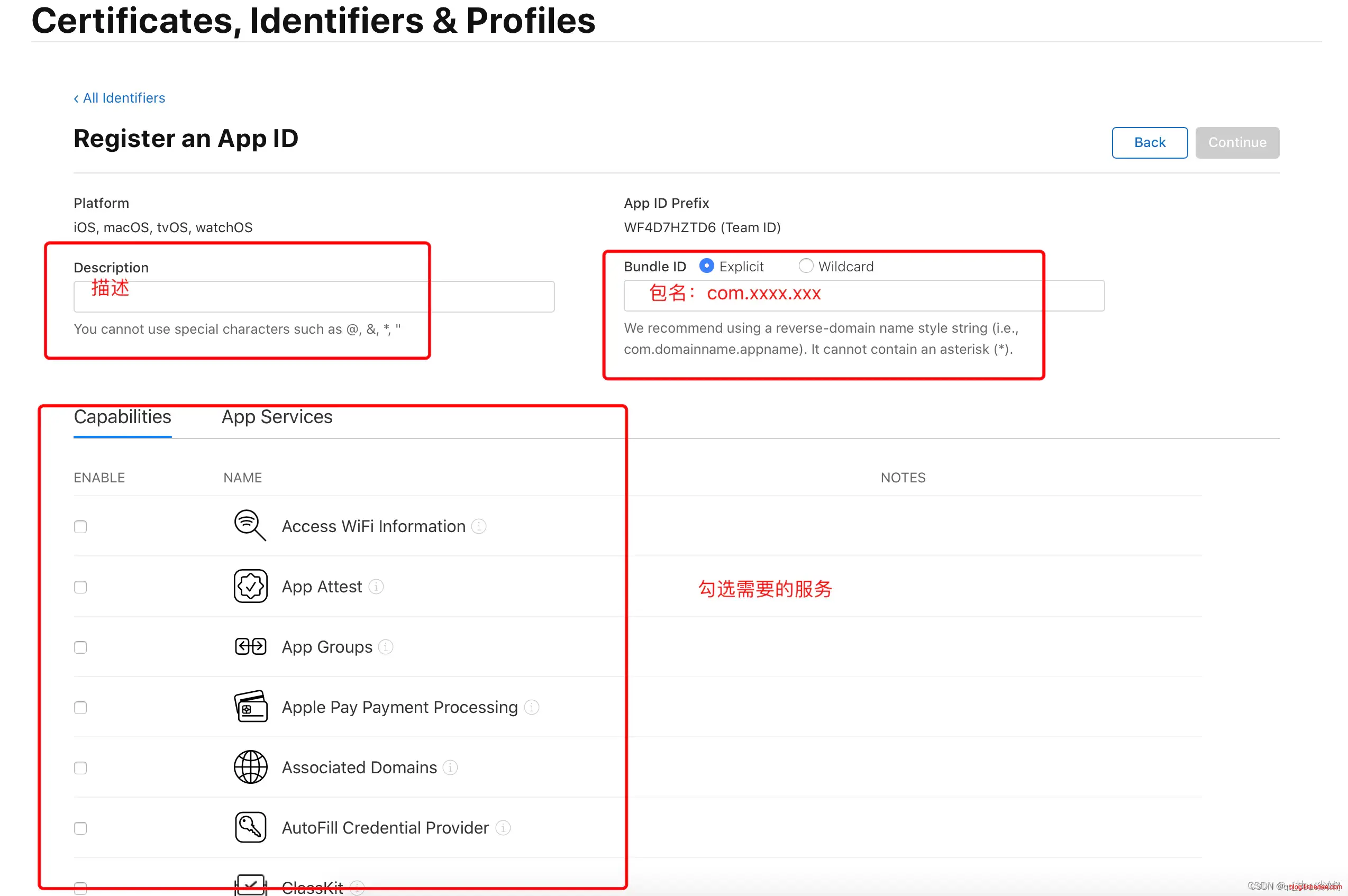 下图所示:Bundle ID 选择 “Explicit”,在 Description 中填写描述,然后填写 Bundle ID,Bundle ID 要保持唯一性,建议填写反域名加应用标识的格式 如:“com.xxxx.xxx”, 接下来需要选择应用需要使用的服务(如需要使用到消息推送功能,则选择“Push Notifications”),然后点击 “Continue”。确认后选择提交,回到 identifiers 页面即可看到刚创建的App ID。