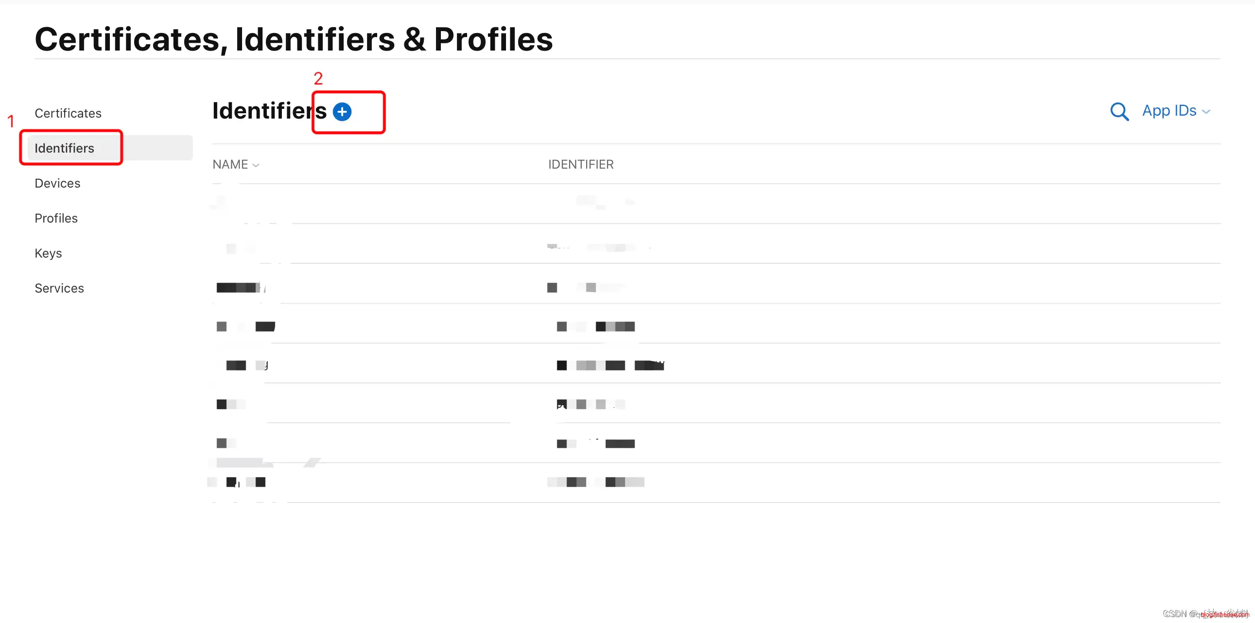 选择页面的 “Identifiers” 可查看到已申请的所有 App 应用标识,点击页面上的加号来创建一个新的应用标识