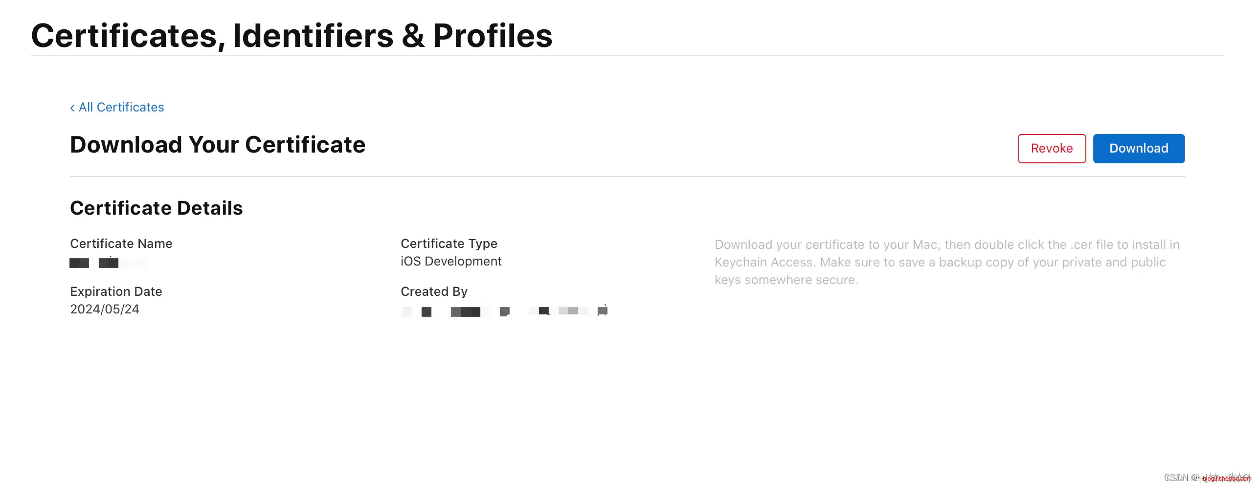生成证书后选择 “Download” 将证书下到本地 (ios_development.cer)